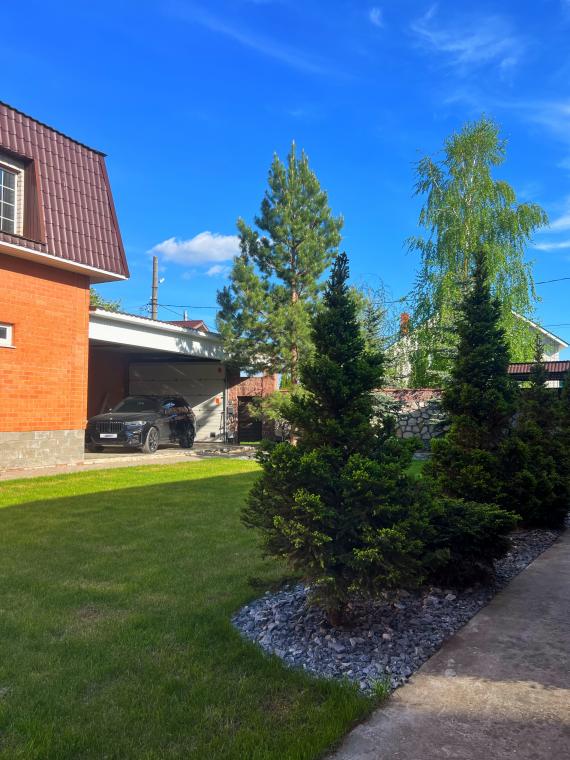 На территории: Ландшафтный дизайн, ухоженный газон, профессиональная система автополива с возможностью управления через телефон из любой точки Земли, просторные гаражи на 5 а/м, площадка под навесом на 3 а/м.